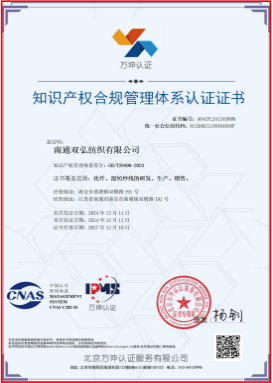 Teollis- ja tekijänoikeuksien noudattamisen hallintajärjestelmän sertifiointi on vaatimustenmukaisuuden arviointitoiminta, jossa kolmannen osapuolen sertifiointielin arvioi yrityksen sisäistä immateriaalioikeuden hallintajärjestelmää vahvistaakseen, että se noudattaa asiaankuuluvien kansallisten standardien tai teknisten eritelmien vaatimuksia. Tällä hetkellä Double Great Company -yrityksellä on 5 kotimaisen rekisteröityä tavaramerkkiä ja 2 Madrid International -rekisteröityä tavaramerkkiä. Kaksinkertainen suuri tavaramerkki on tunnettu tavaramerkki Kiinassa; Siinä on yli 50 kansallista keksintöpatenttia ja hyötymallipatenttia, ja se voitti Kiinan tekstiiliteollisuuden patentti kultapalkinnon; Se on toteuttanut 4 kansallista taskulamppu- ja 5 kipinäsuunnitelmaprojektia; Se on laatinut 3 kansallista standardia, 11 teollisuusstandardia, 4 ryhmästandardia ja 3 tullikäsittelykaupan yksikön kulutusstandardia; Se on suorittanut teollisuuden ja yliopistojen tutkimuksen, ja viisi keskeistä tekniikkaa sekä tieteellistä ja teknologista saavutusprojektia ovat voittaneet Kiinan tekstiiliteollisuuden tieteen ja teknologian etenemisen toisen palkinnon.